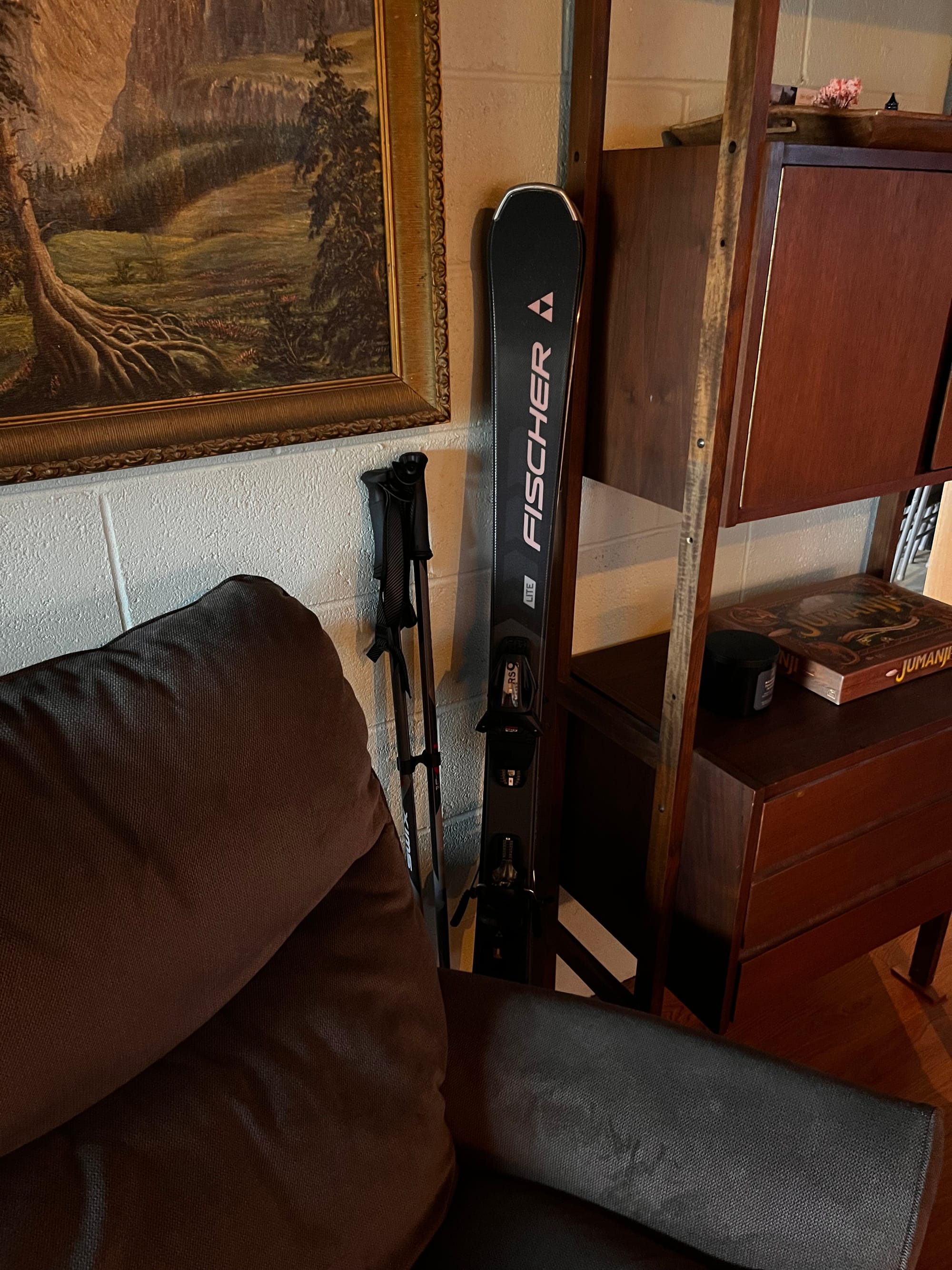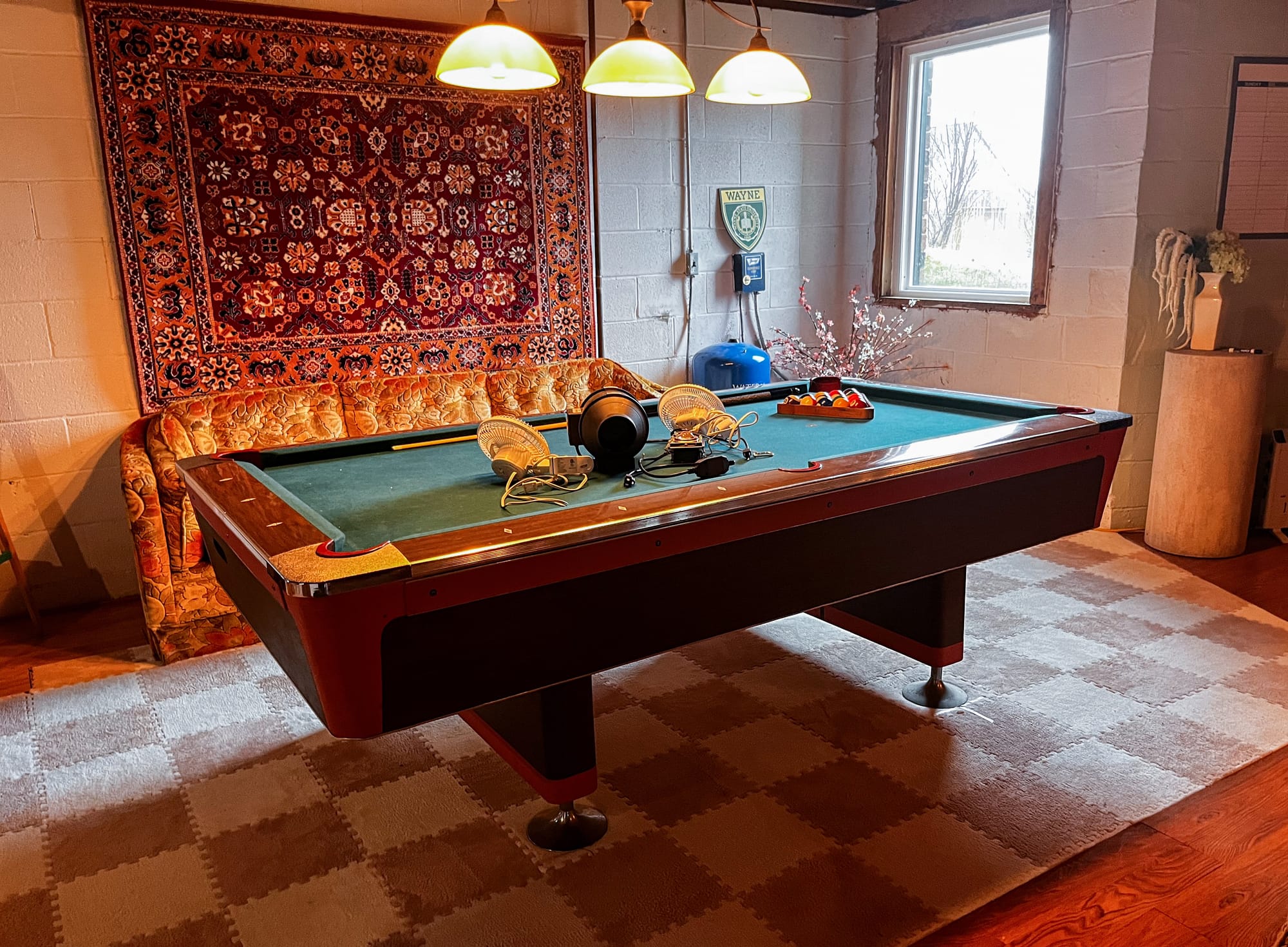 The pool table was meant for billiards, but most of the time it becomes whatever requires a surface like projects, overflow, or something mid process that hasn’t found a permanent place yet. The floral couch behind it came from my grandma’s lake house while the wall tapestry from pre-war Poland. Neither were placed to make a point, but they anchor the room in a way newer things don’t.