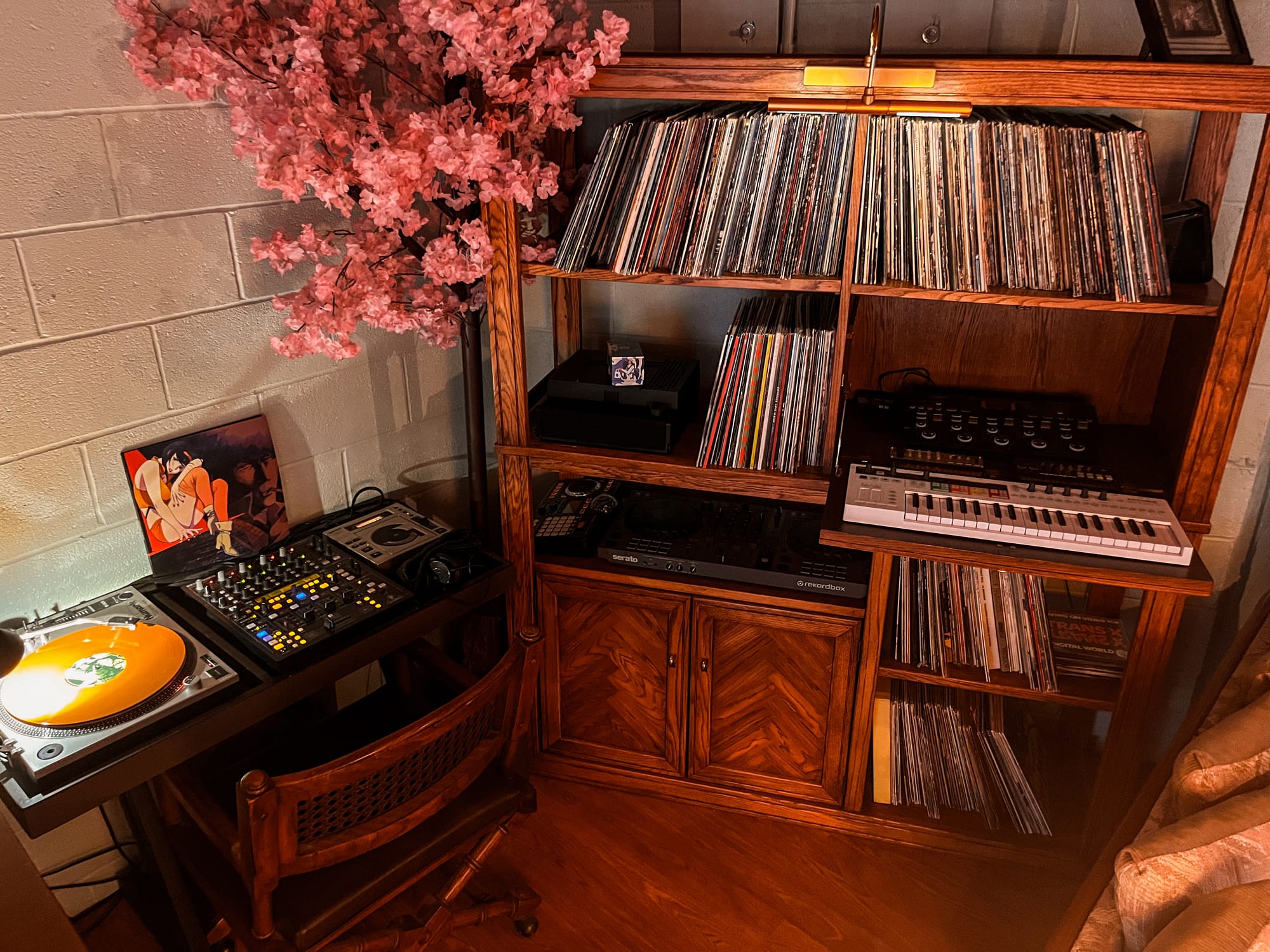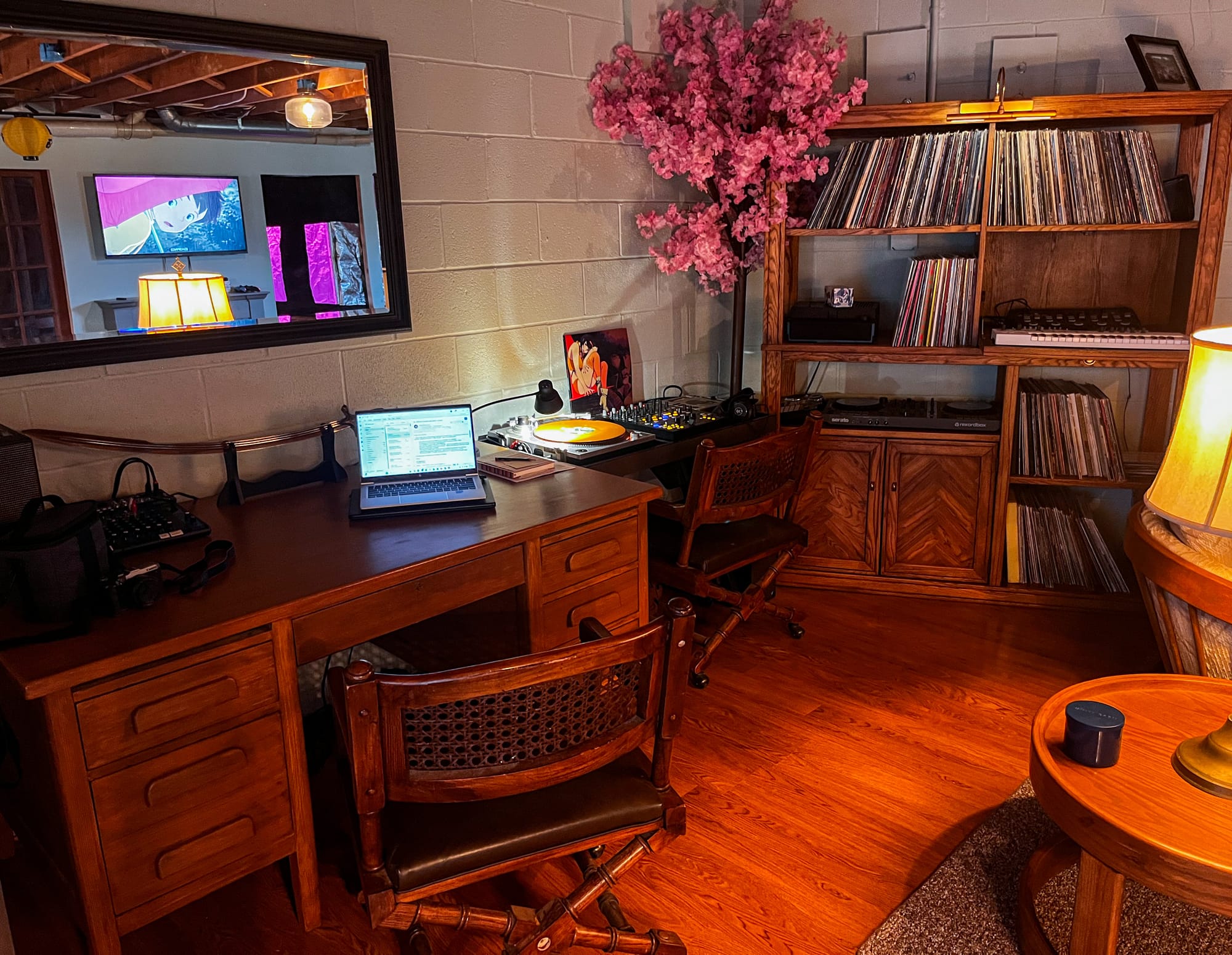 Along one side, the desk carries two versions of the same space. During the day it’s where my professional work happens. By night it becomes something else entirely; records, mixing, adjusting sound until it feels right. The vinyl is constant either way.