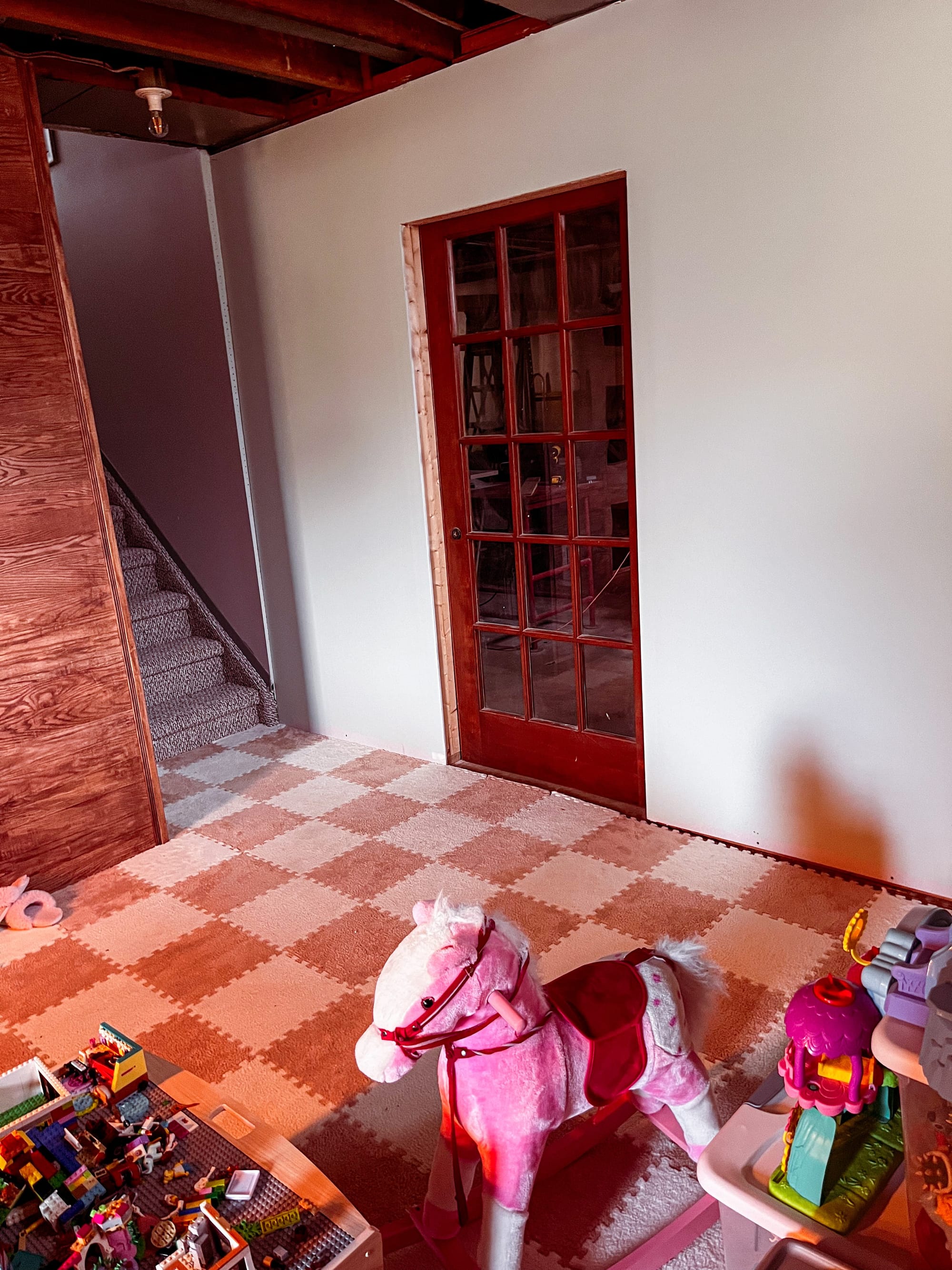 At the base of the stairs, the play area stays within reach. It’s not separate from the rest of the room, but part of it. Toys move in and out for now; eventually they will have a place of their own. Storage solutions are already planned, just not built yet.