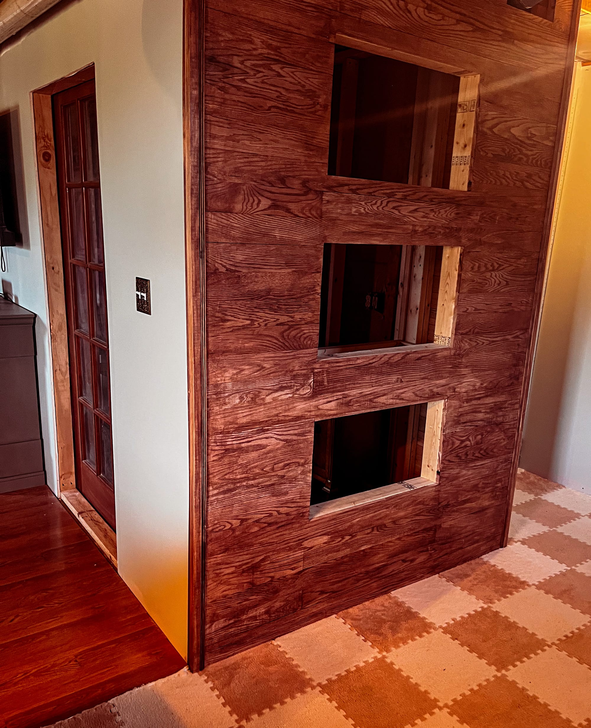 The structure is already taking shape. A wall of enclosures will run in tiers: a lower section for a blue tongue skink that can move freely, a mid-level for Ember, and taller vertical spaces on either side for a future gargoyle gecko breeding setup. Above that, room left open for whatever comes next.