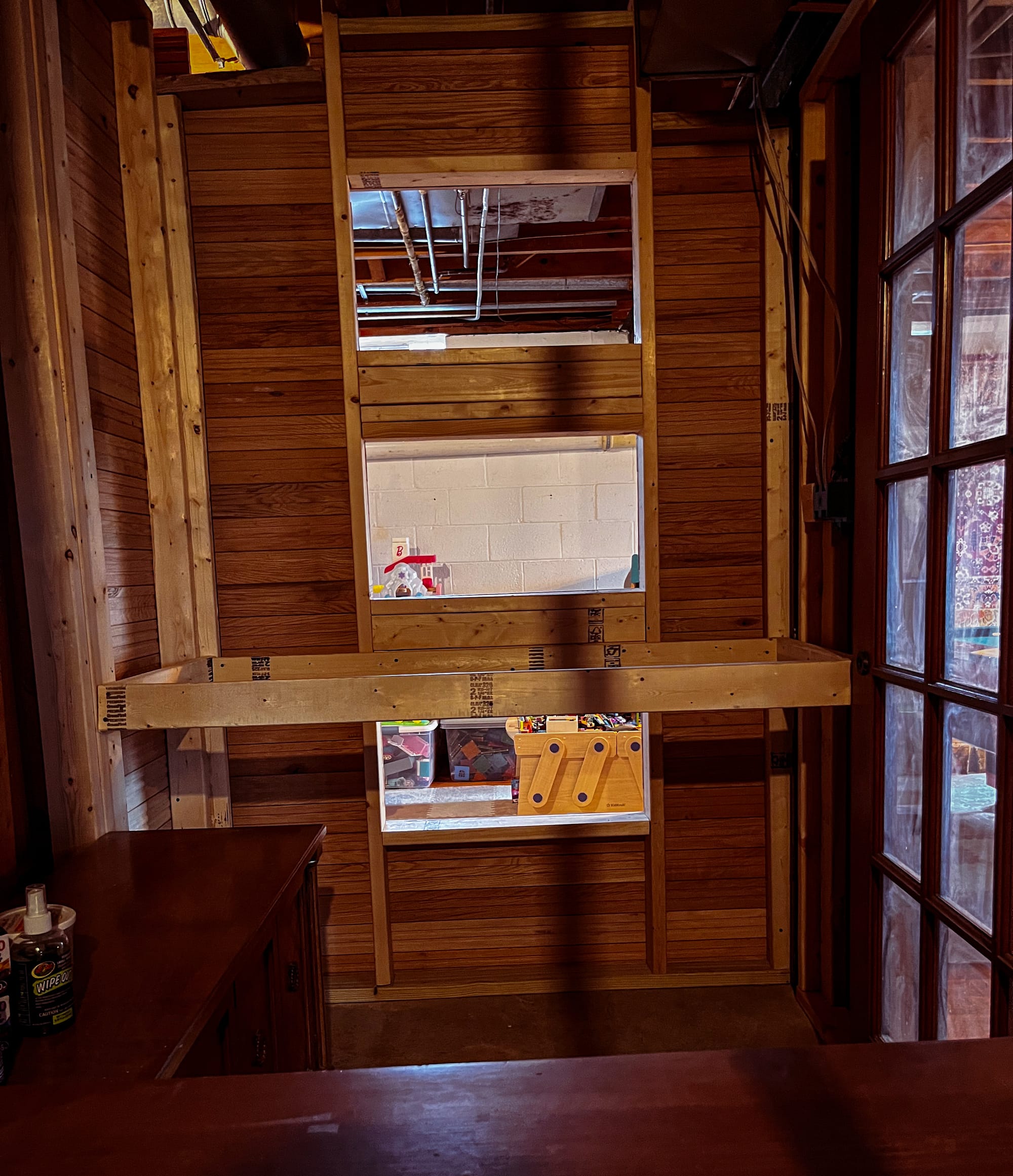 Three windows will bring light in from The Lodge but will also allow the enclosures to be seen from outside of the room; not fully separated, but not fully shared either. On the opposite wall, a small desk will make the space usable beyond maintenance. A place to sit, prepare food, write things down, and spend time without needing a task. Above it, small growing shelves for microgreens, alpine strawberries, and possibly additional enclosures depending on how the space evolves.