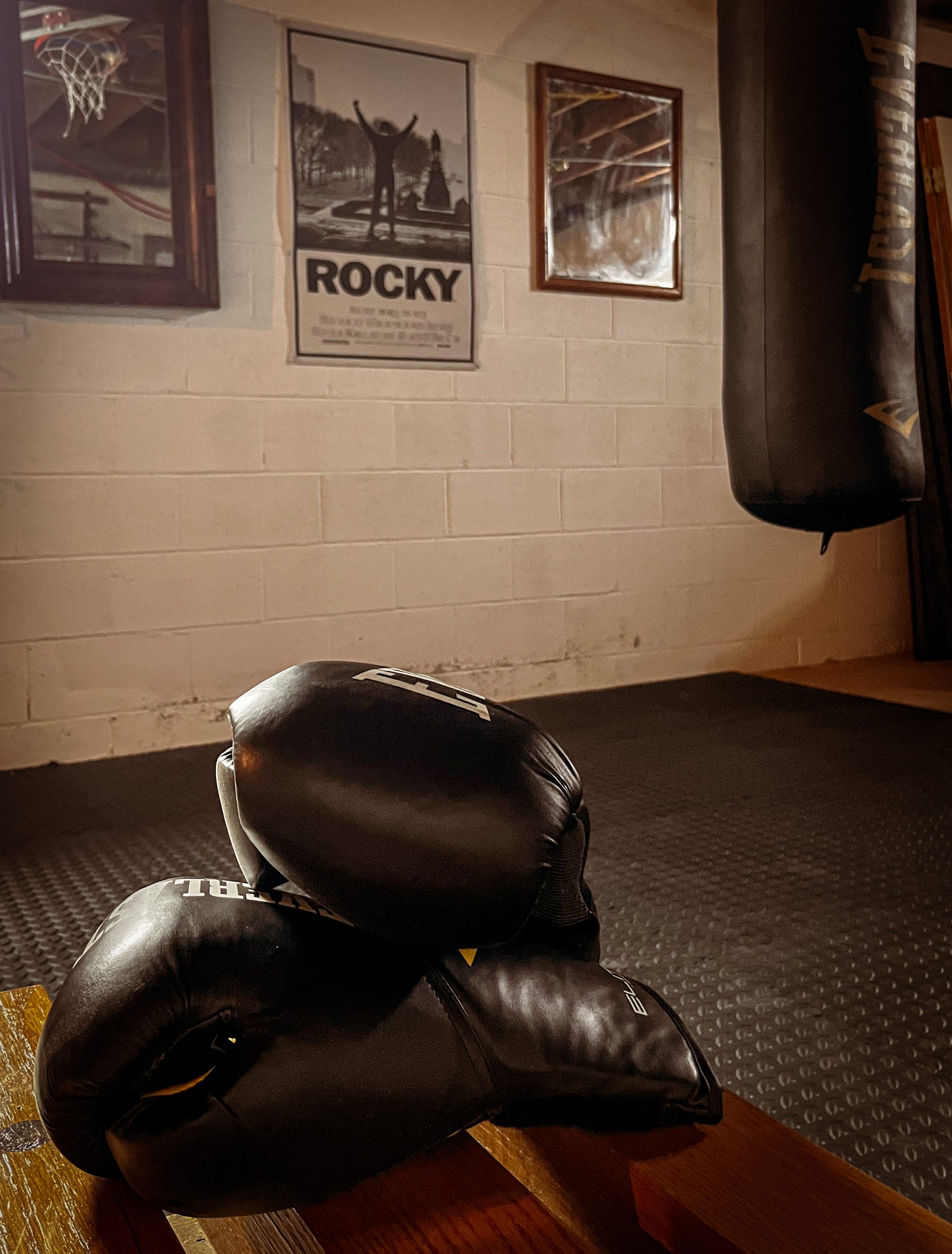 Toward the back, the space tightens into something more focused: a rubber floor. heavy bag, gloves, and dumbbells. A small gym my buddy and I built together. A place where we meet to punch, sweat, catch up, and let music run loud for a while. It doesn’t follow a strict schedule, but it’s there when we need it.