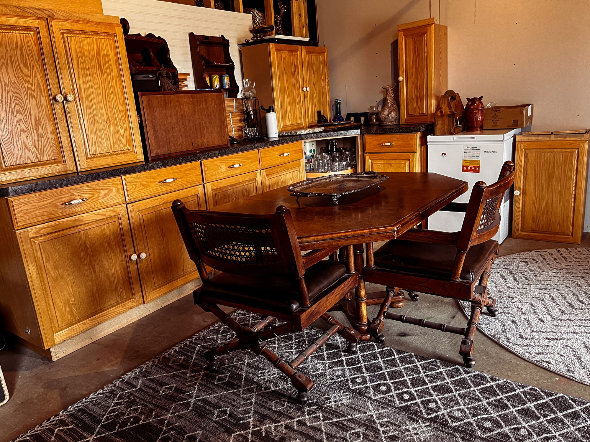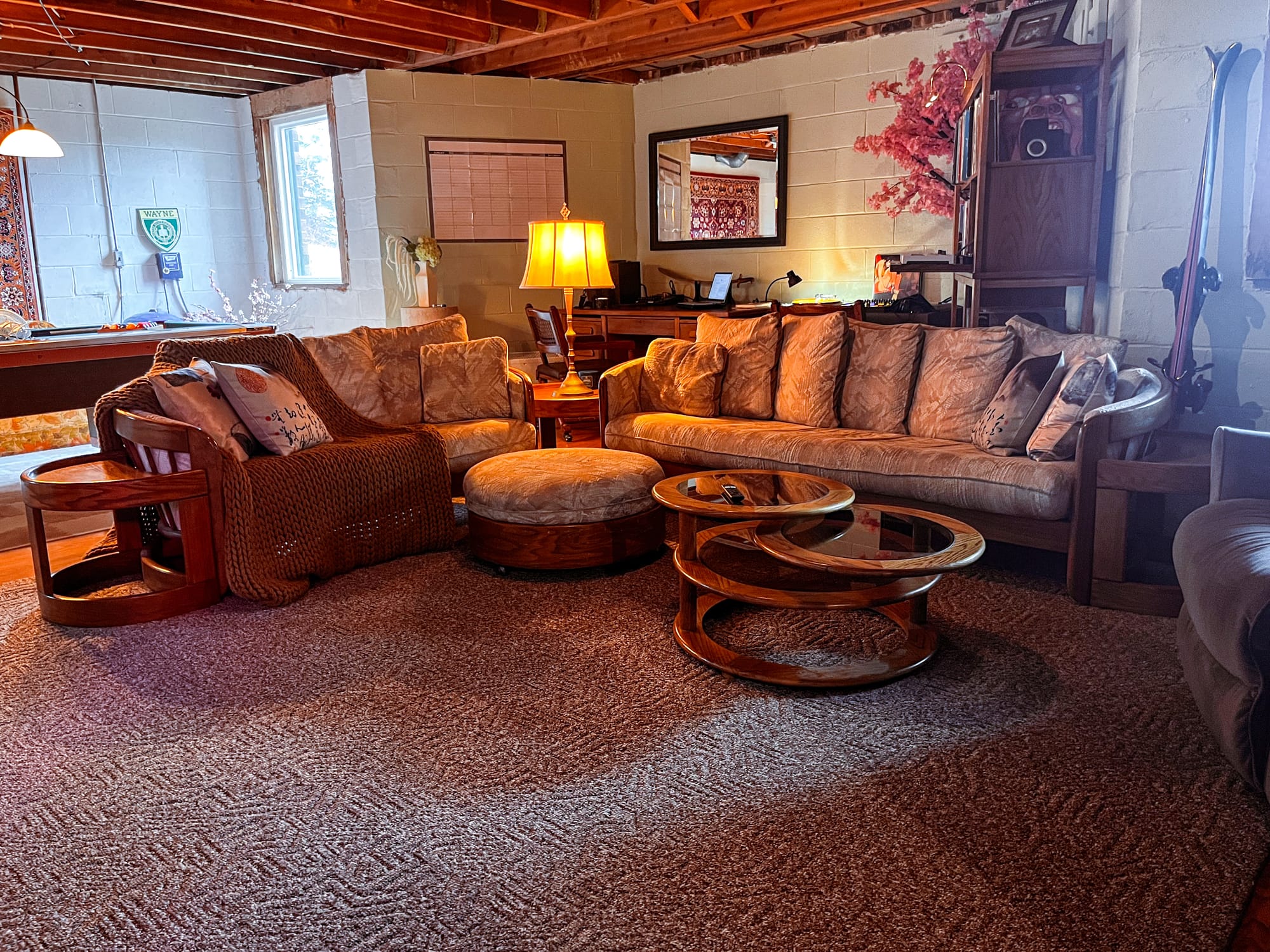 The fire feature takes the edge off the basement chill in the winter, and the seating pulls people toward the center. Conversations happen here, but so do long pauses where nothing in particular needs to be happening. Often that time ends up in the reclining chair, where ideas sit for a while before going anywhere. furniture carries late mid-century modern feel; solid, one-of-a-kind pieces that weren’t chosen to match anything perfectly but somehow ended up defining the vibe of the room anyway.